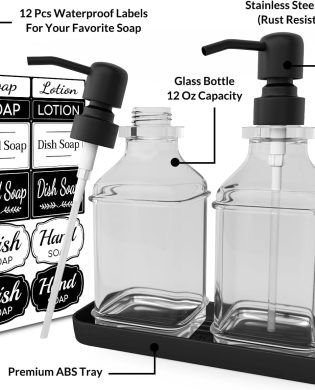 Introducing our Soap Dispenser – 2 Pack, a stylish and functional addition to your kitchen or bathroom. Each dispenser features an antique design with thick glass construction and a sturdy tray for added durability. The 304 rust-proof stainless steel black pump ensures smooth and effortless dispensing of hand soap. This set comes with 12pcs stickers…